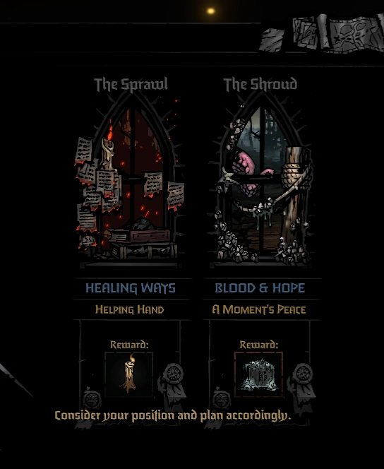 The player will be given a choice of the next Region to traverse. There will always be at least two choices and up to three. Regions (besides The Sluice) will have both a modifier and a goal listed.